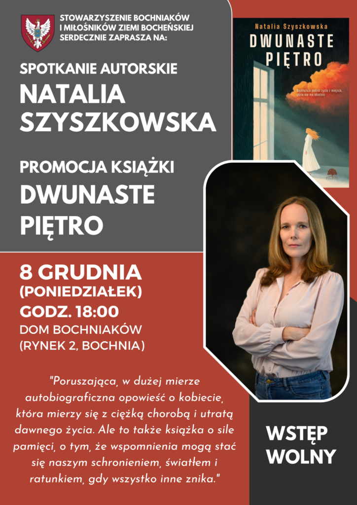 Stowarzyszenie Bochniaków i Miłośników Ziemi Bocheńskiej zaprasza na spotkanie autorskie z Natalią Drwalwską, które odbędzie się w Domu Bochniaków w poniedziałek o godz. 18:00. Spotkanie będzie poświęcone promocji jej najnowszej książki „Dwunaste Piętro”.