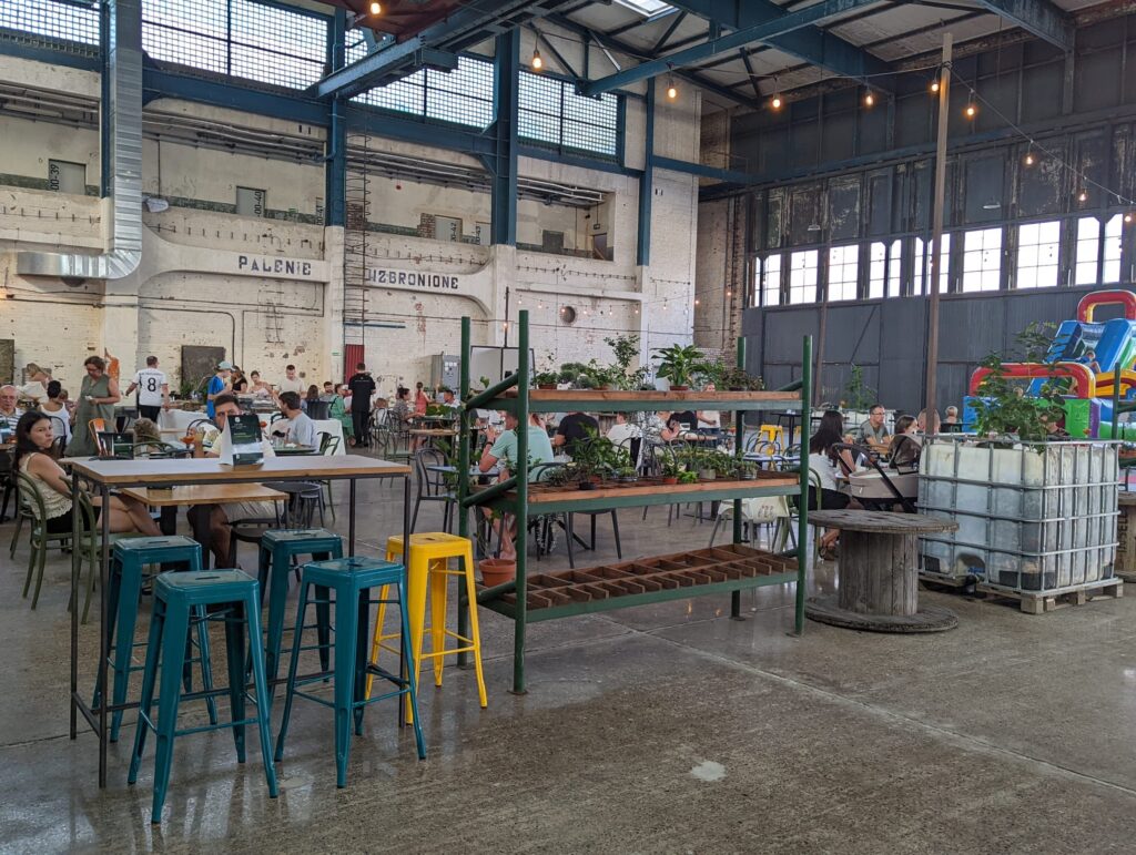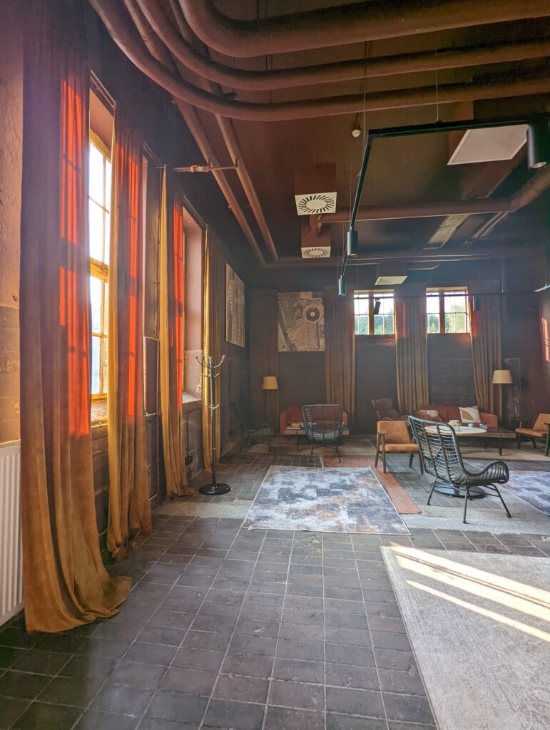 Fabryka samolotów, Mielno. Fot. Martyna JabłońskaW industrialnym wnętrzu historycznego hangaru fabryki samolotów ściany są wciąż odrapane, podłoga jest z surowego betonu, a z framug okiennych odpada farba. Minimalistycznie odnowiono tylko to, co niezbędne, jak łazienki czy sypialnie. W hangarze mieści się wystawa zdjęć i artefaktów z czasów II wojny światowej. Tu choćby kino zbudowane jest prowizorycznie – z użyciem kontenera i podkładów kolejowych – tak, jak miałoby to miejsce podczas wojny, gdy wszystkiego brak.