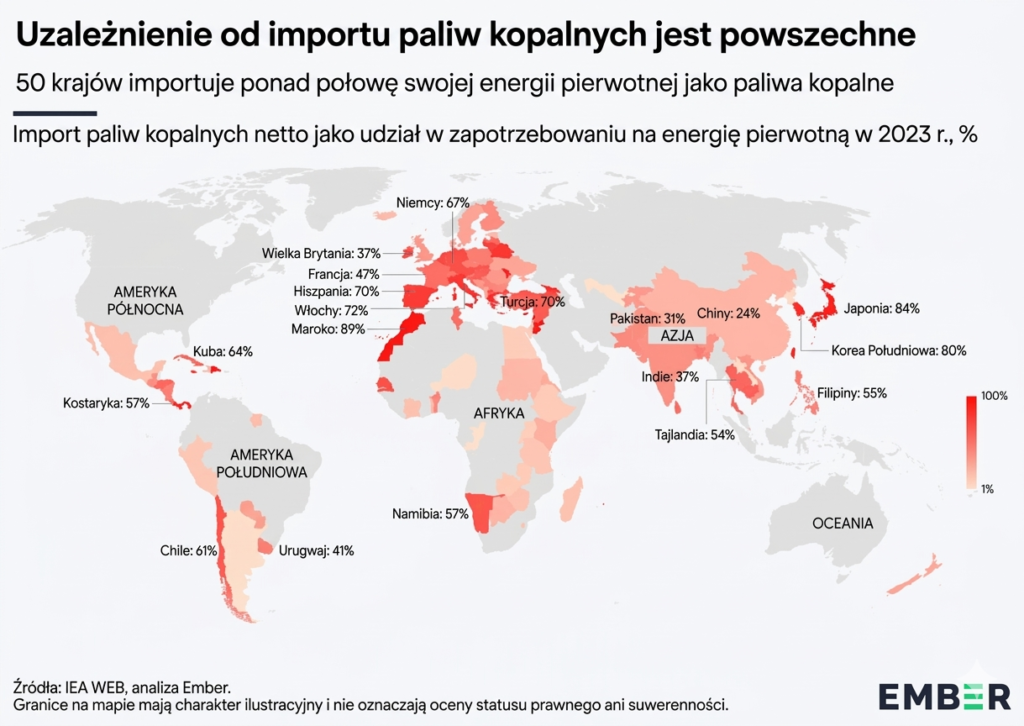 Źródło: Ember.Powyższa grafika pokazuje, w jakim stopniu wiele państw w dalszym ciągu jest zależnych od innych. W ostatnich latach globalne wydatki na import paliw kopalnych sięgały choćby 1,7–1,8 biliona dolarów rocznie. Te pieniądze w większości trafiają do państw, które nie zawsze są nam przychylne, często są rządzone przez dyktatorów, szejków czy królów. Obecny konflikt na Bliskim Wschodzie pokazuje, z kim mamy do czynienia.