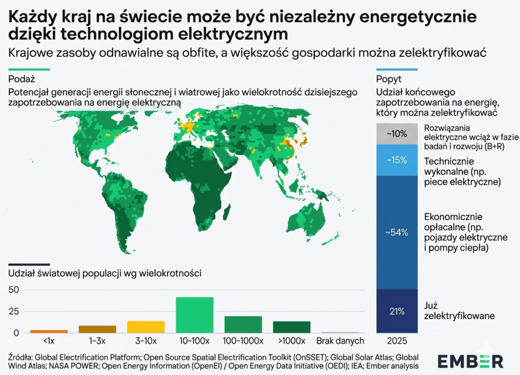 Trzy główne dźwignie odpowiadają za większość tej transformacji. Energia słoneczna i wiatrowa zastępują produkcję energii opartą na importowanych paliwach kopalnych. Pojazdy elektryczne zastępują importowaną ropę w transporcie drogowym. Pompy ciepła zastępują importowany gaz i ropę w sektorze ogrzewania. Gdyby wszystkie trzy rozwiązania zostały wdrożone na szeroką skalę w swoich sektorach, kraje importujące mogłyby obniżyć rachunki za import o około 70 proc.